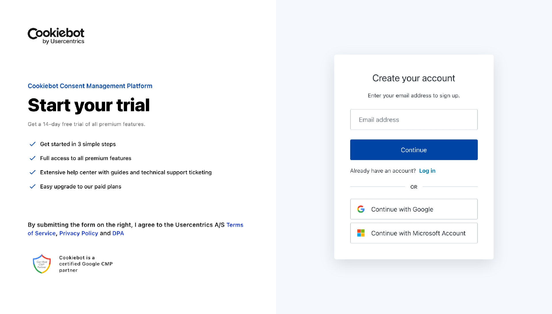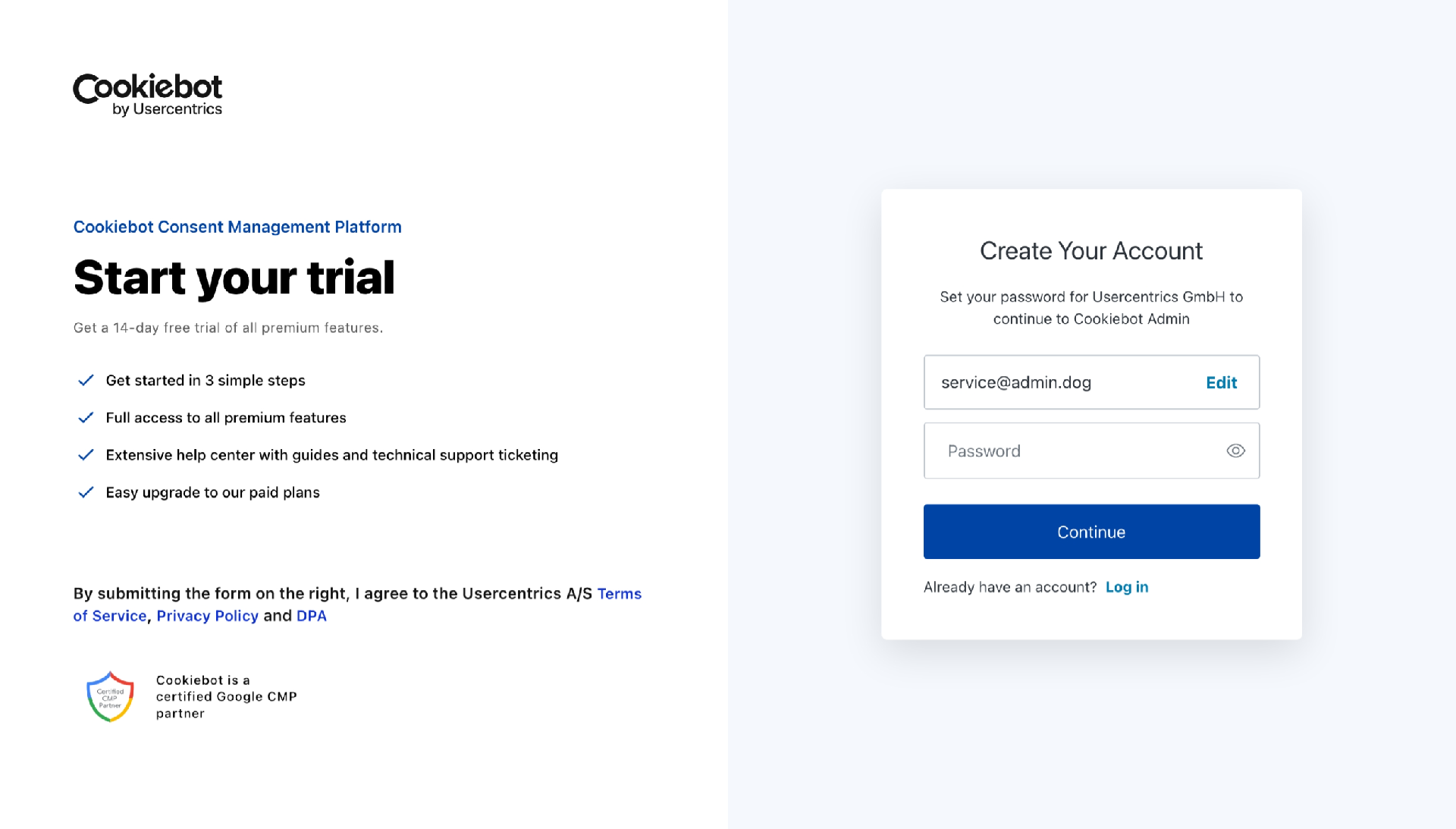 (1)在Cookiebot主頁右上角,點擊”Free trial“,進入注冊頁面,填寫郵箱: