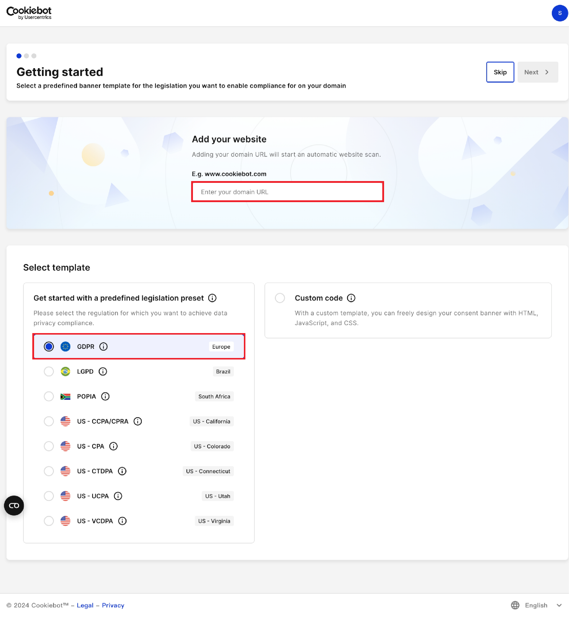 填寫您代配置的網站域名URL;選擇法規(guī)模版為”GDPR“,點擊NEXT以完成后續(xù)步驟;