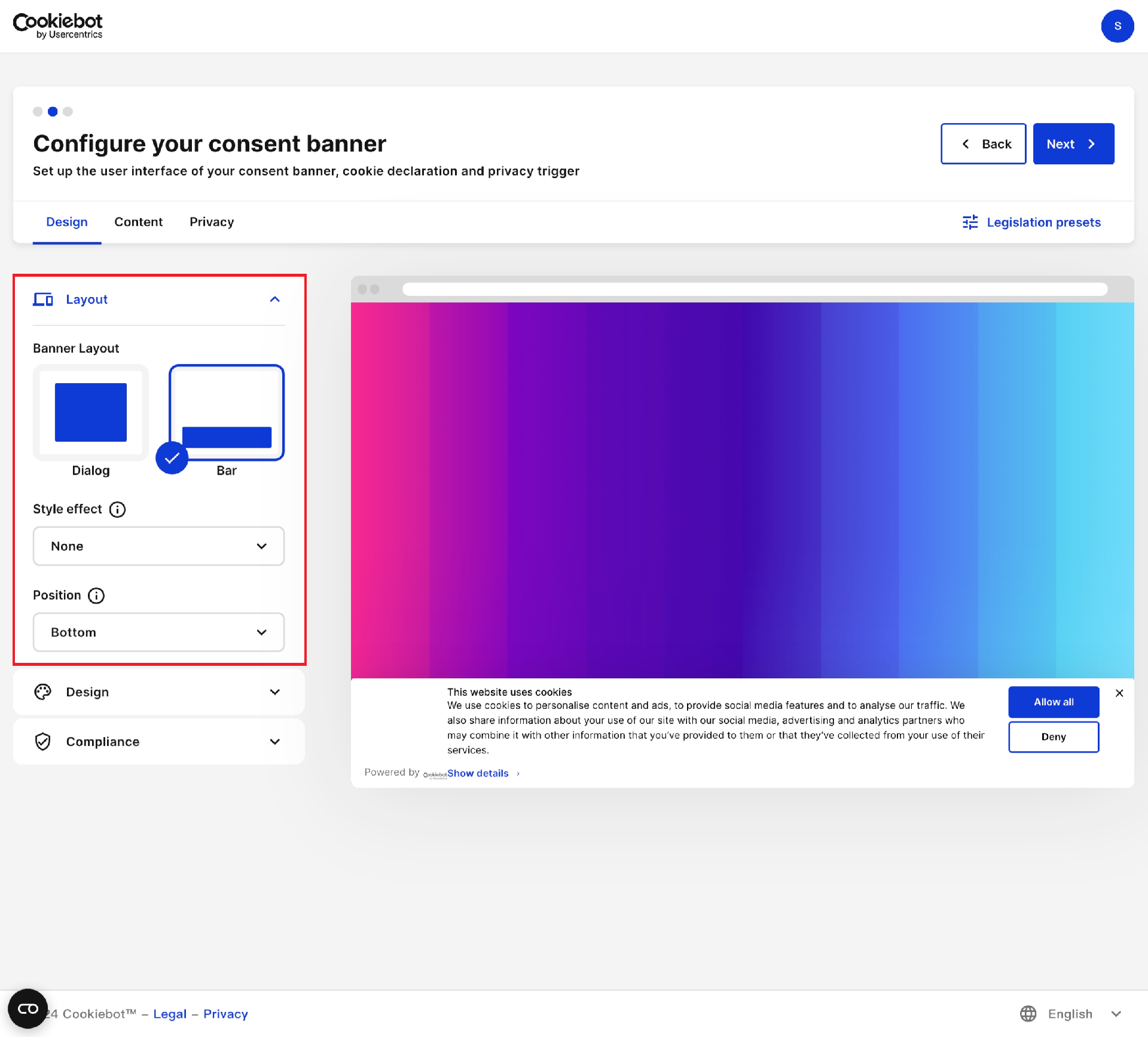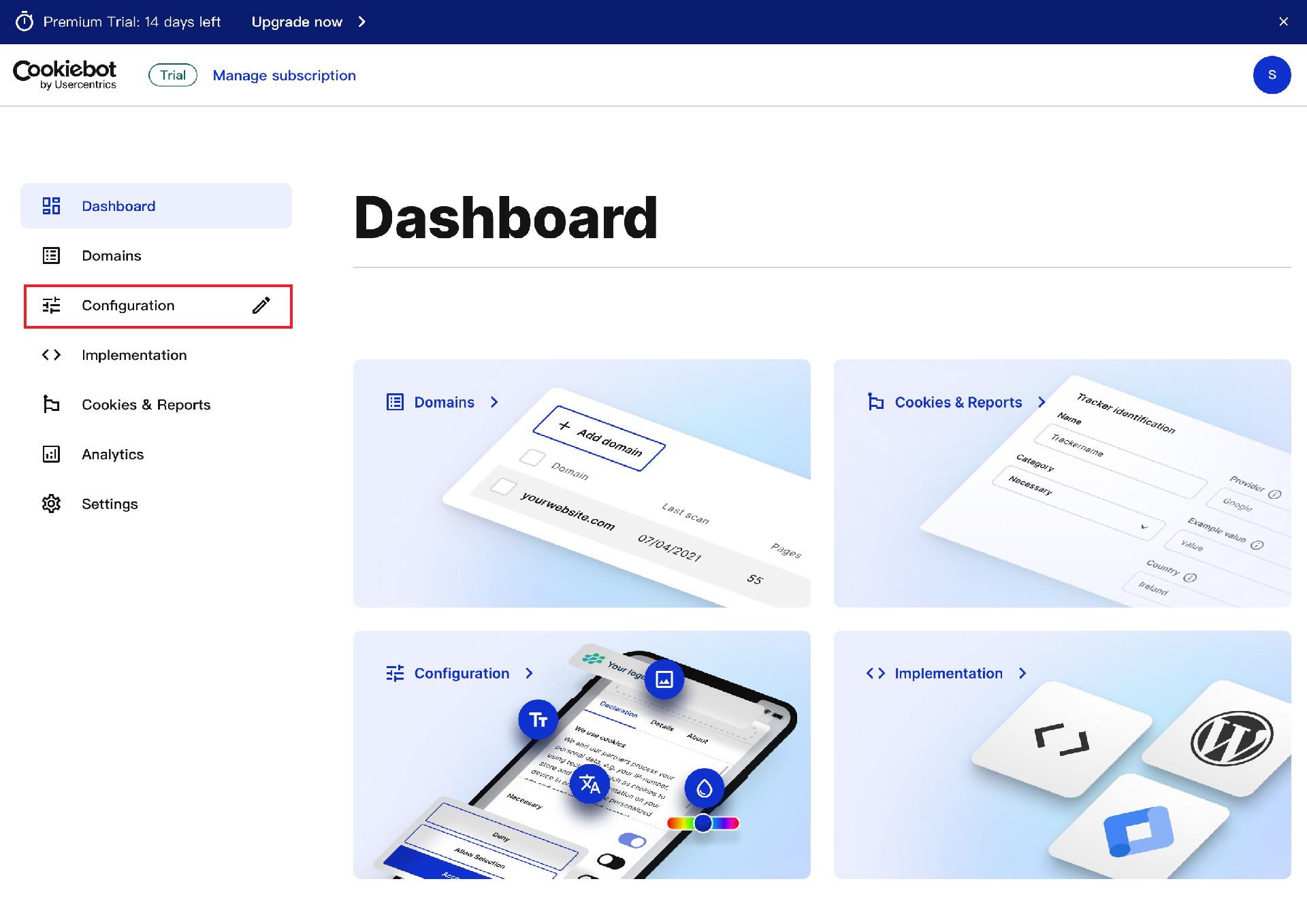 如果您不希望所有國家的網站訪客都收到此 CMP Banner,則您可以在Cookiebot中按圖示進行設置,點擊”Configuration“按鈕,進入Design界面;