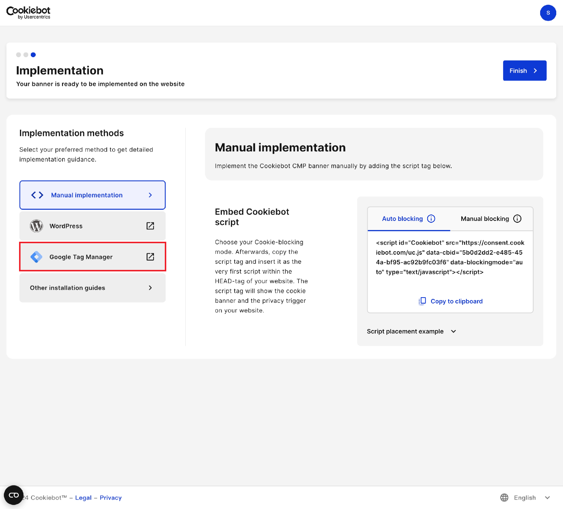 上述步驟處理完畢后,接下來將接入到CMP部署環(huán)節(jié);目前我們推薦您使用Google TagManager方式將CMP代碼部署到網站中,此方式方便后續(xù)集中管理應用在網站中的代碼;