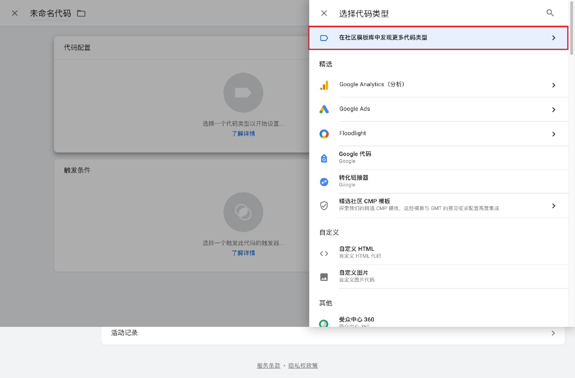 (3)在”選擇代碼類型”側邊欄中,點擊“在社區(qū)模版庫中發(fā)現(xiàn)更多代碼類型“;