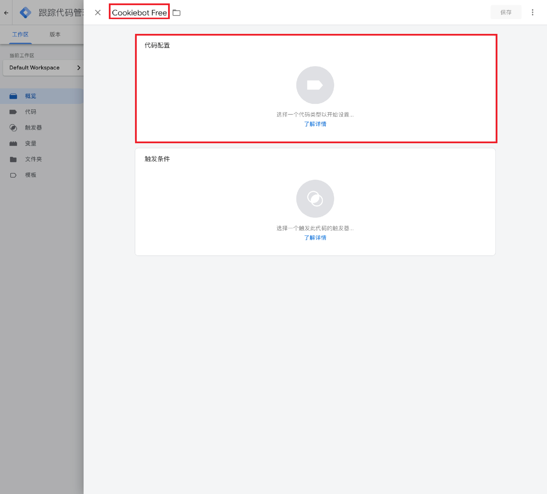 (2)為代碼命名,方便后續(xù)管理,例如”Cookiebot Free“。點擊”代碼配置“模塊;