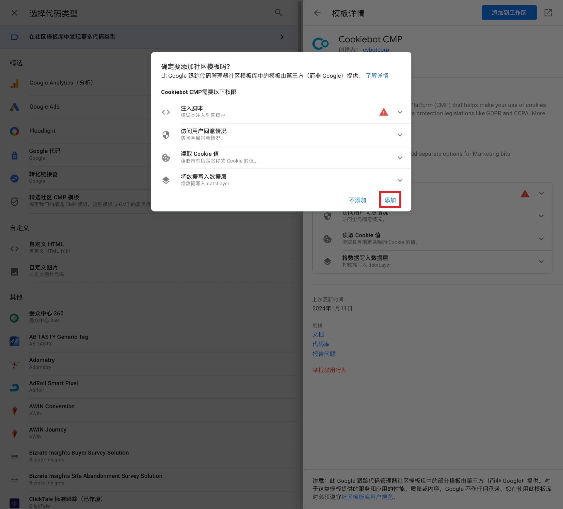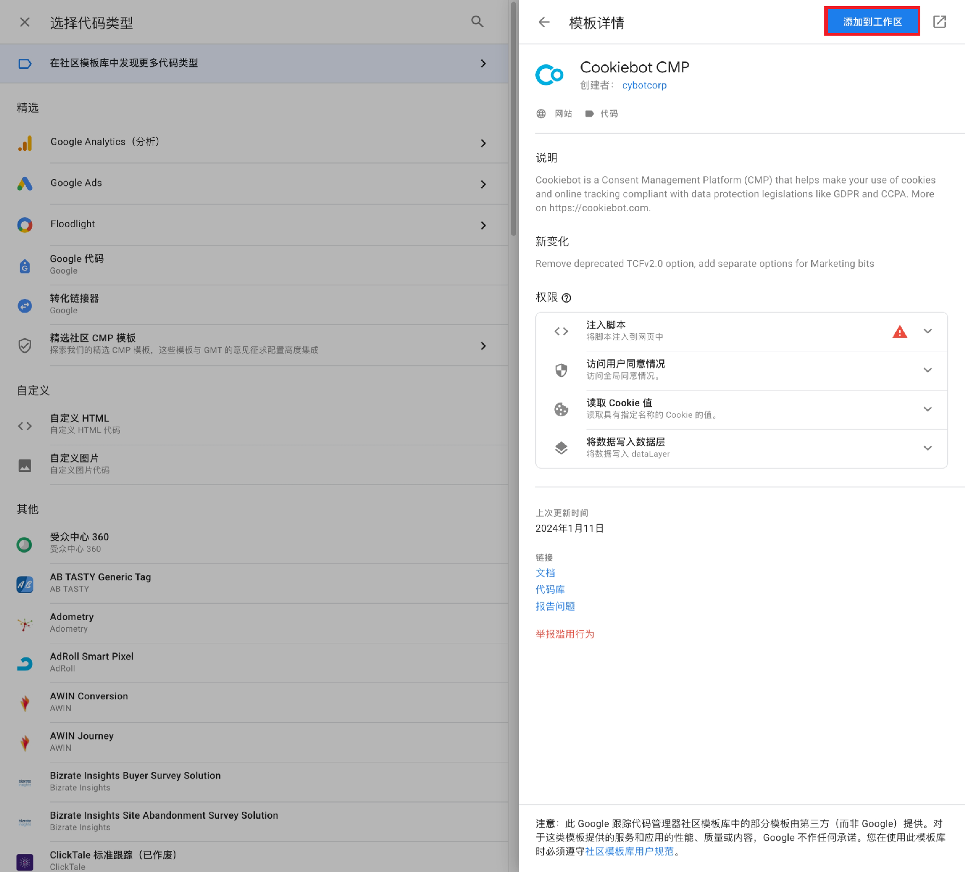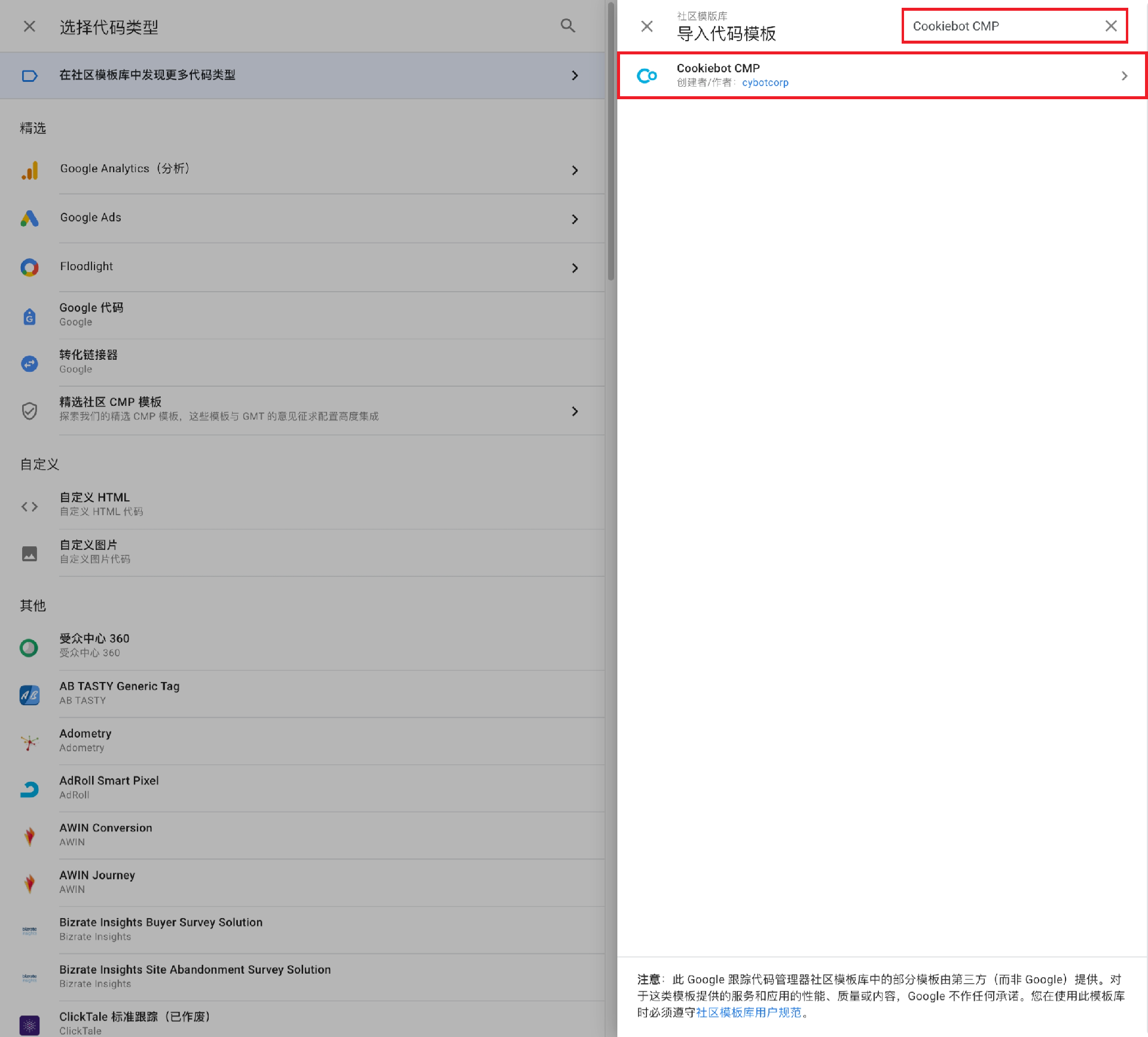 (4)在“導入代碼模版”側邊欄中,搜索“Cookie CMP”,并點擊搜索結果;