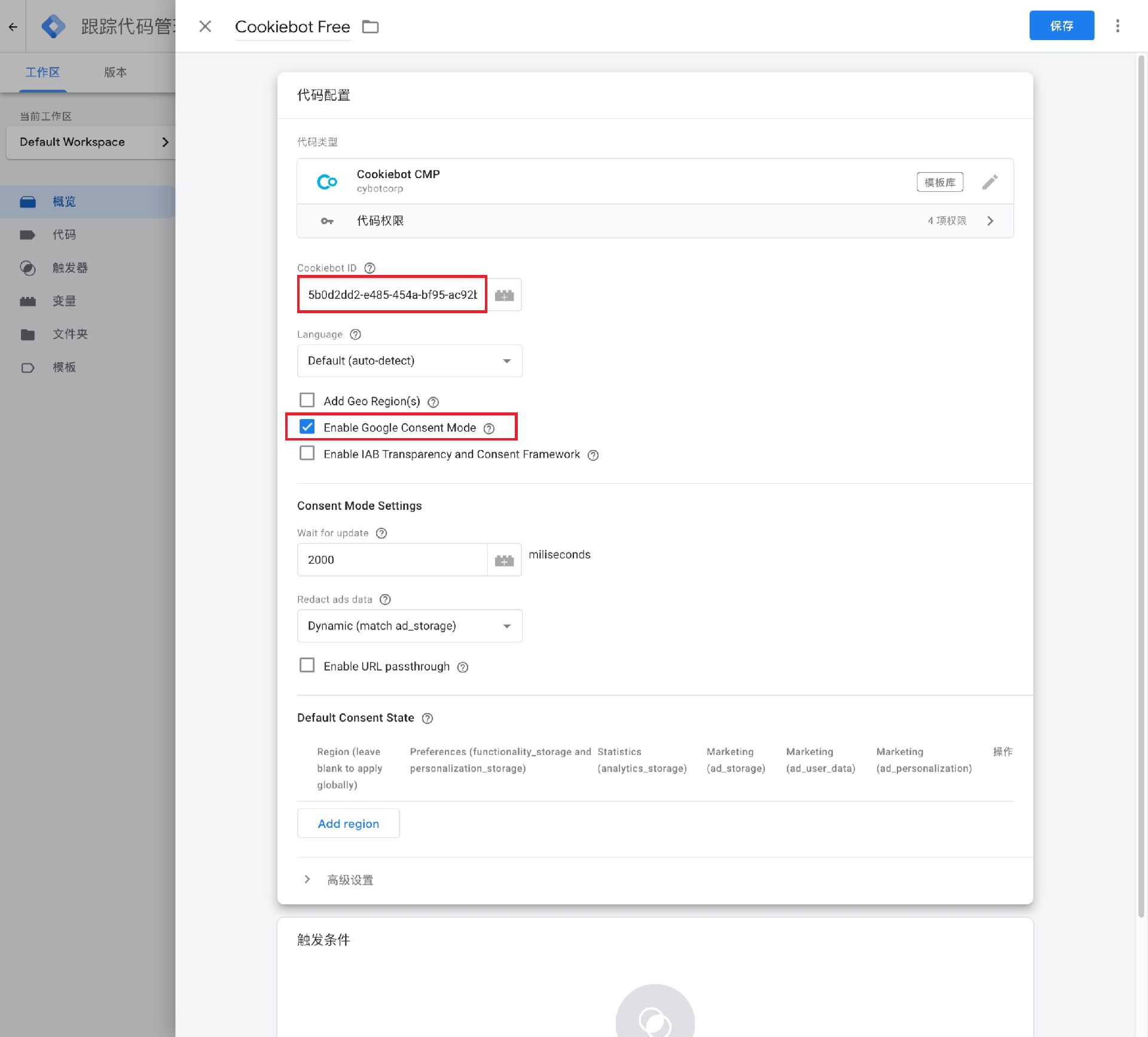 (7)在代碼配置中填寫關鍵信息并配置Consent Mode;