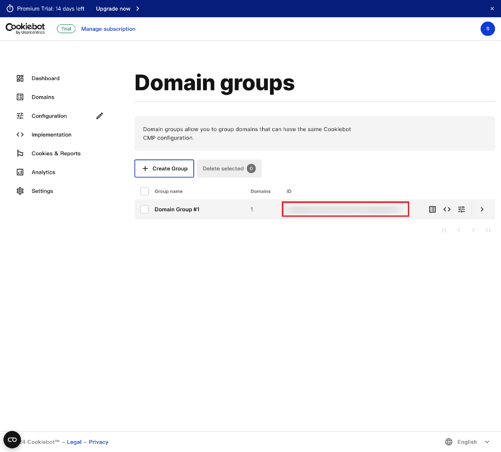 訪問 https://admin.cookiebot.com/domain-groups , 在包含您待配置的域名分組中,復制ID回填至GTM;