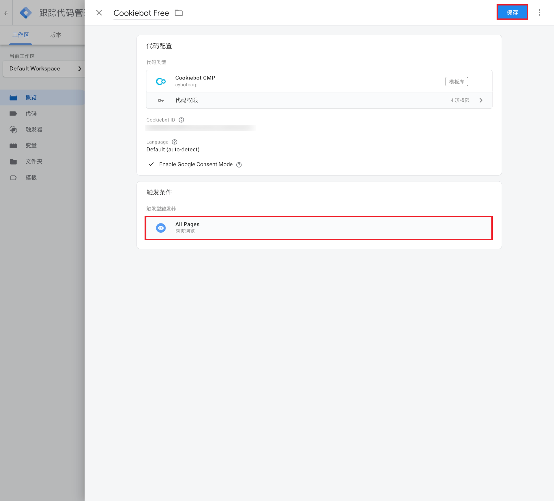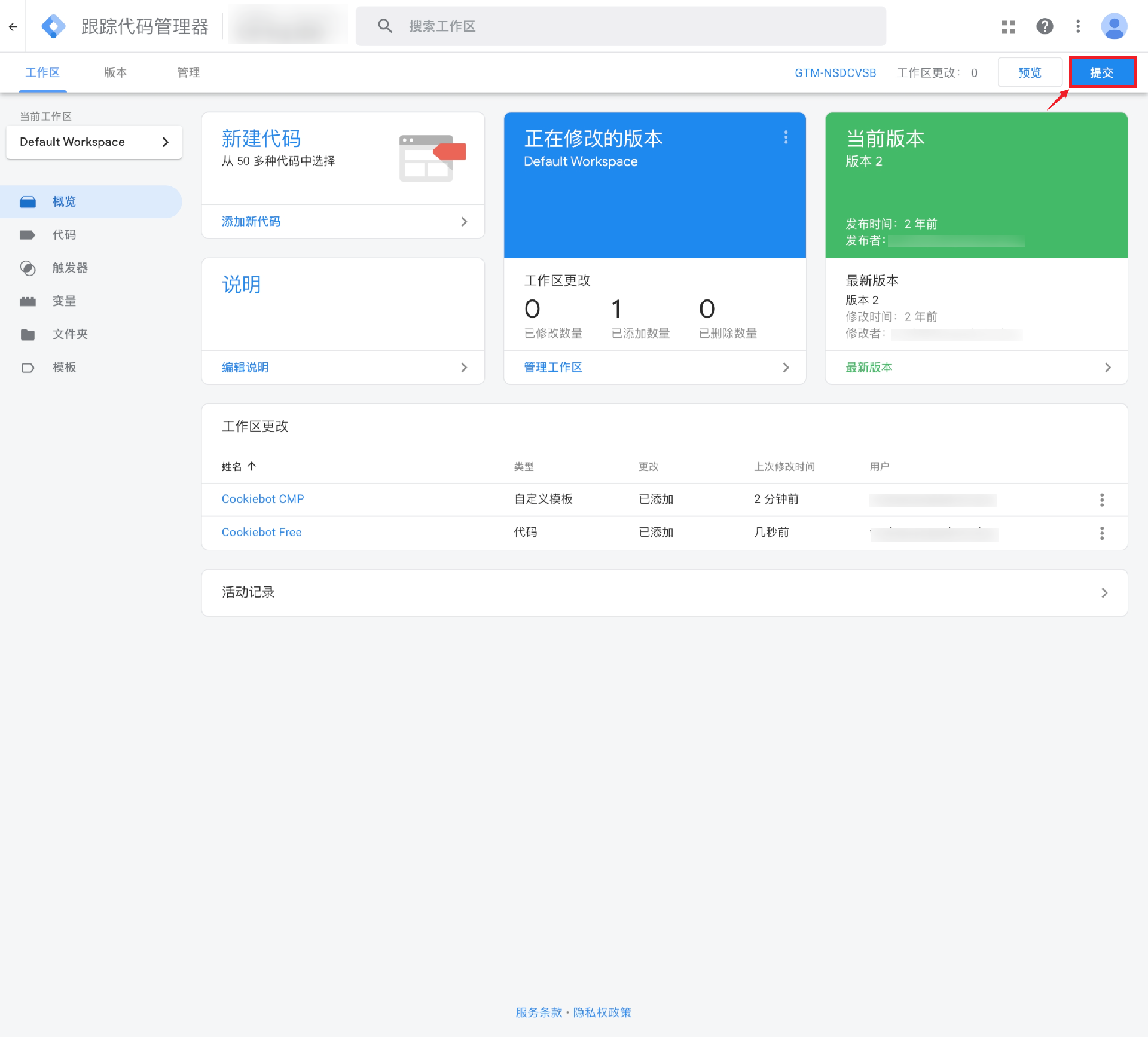 (10)保存完畢后即可提交本次工作更改,完成Cookiebot CMP通過Google TagManager方式部署的過程。
